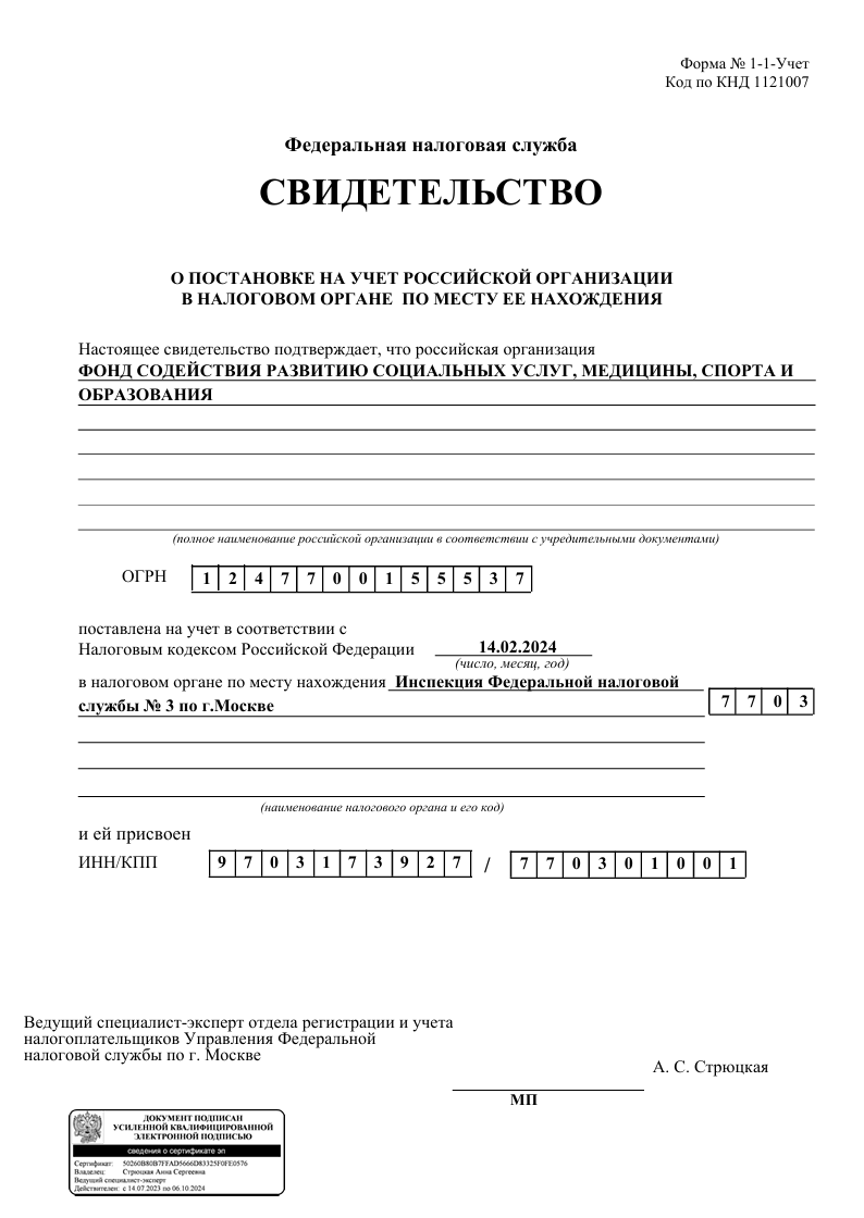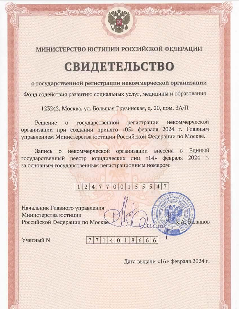 Фонд развития социальных услуг. ОГРН 1247700155537 ИНН 9703173927 КПП 770301001
